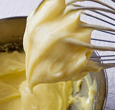 Lớp kem trứng (Crème pâtissière) có độ ngậy vừa phải, cần nấu đúng cách để tránh vón cục & cháy