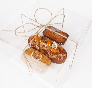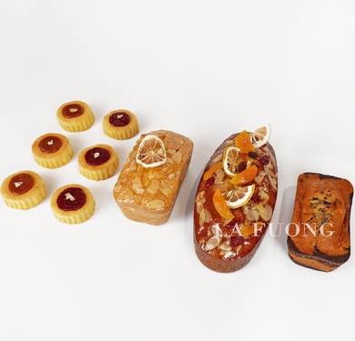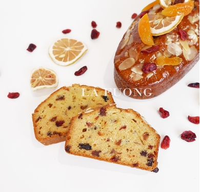 (Wine fruit cake) Xen lẫn trong từng lát bánh là hoa quả khô, miếng bánh mềm ẩm thơm mùi rượu quyến rũ